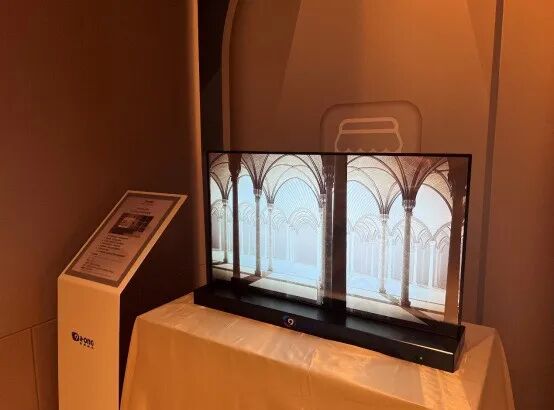 相比其他新品,这款产品通过与虚拟显示结合,将科技感瞬间拉满的同时还可实现显示触摸交互与AR联动功能,充分满足商用服务场景交流互动需求。除此之外,前述工作人员告诉商显世界,这款透明OLED竖屏还可以用作文物展柜的立面,比如展示瓷器文物,屏幕上能投射出文物虚拟图像,并可以通过触控的互动形式,把虚拟瓷器文物从“沙土中取出来”,模拟文物出土的场景,吸引观众体验。