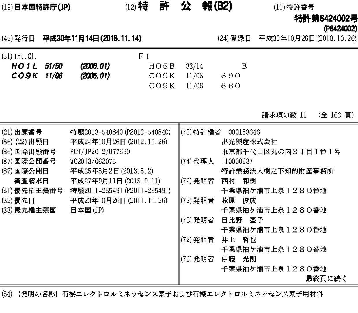 JP6424002B2 | JPWO2013062075A1 | KR1020140094520A | TW201326120A | US10128456 | US10707434 | US20140306207A1 | US20190019972A1 | WO2013062075A1