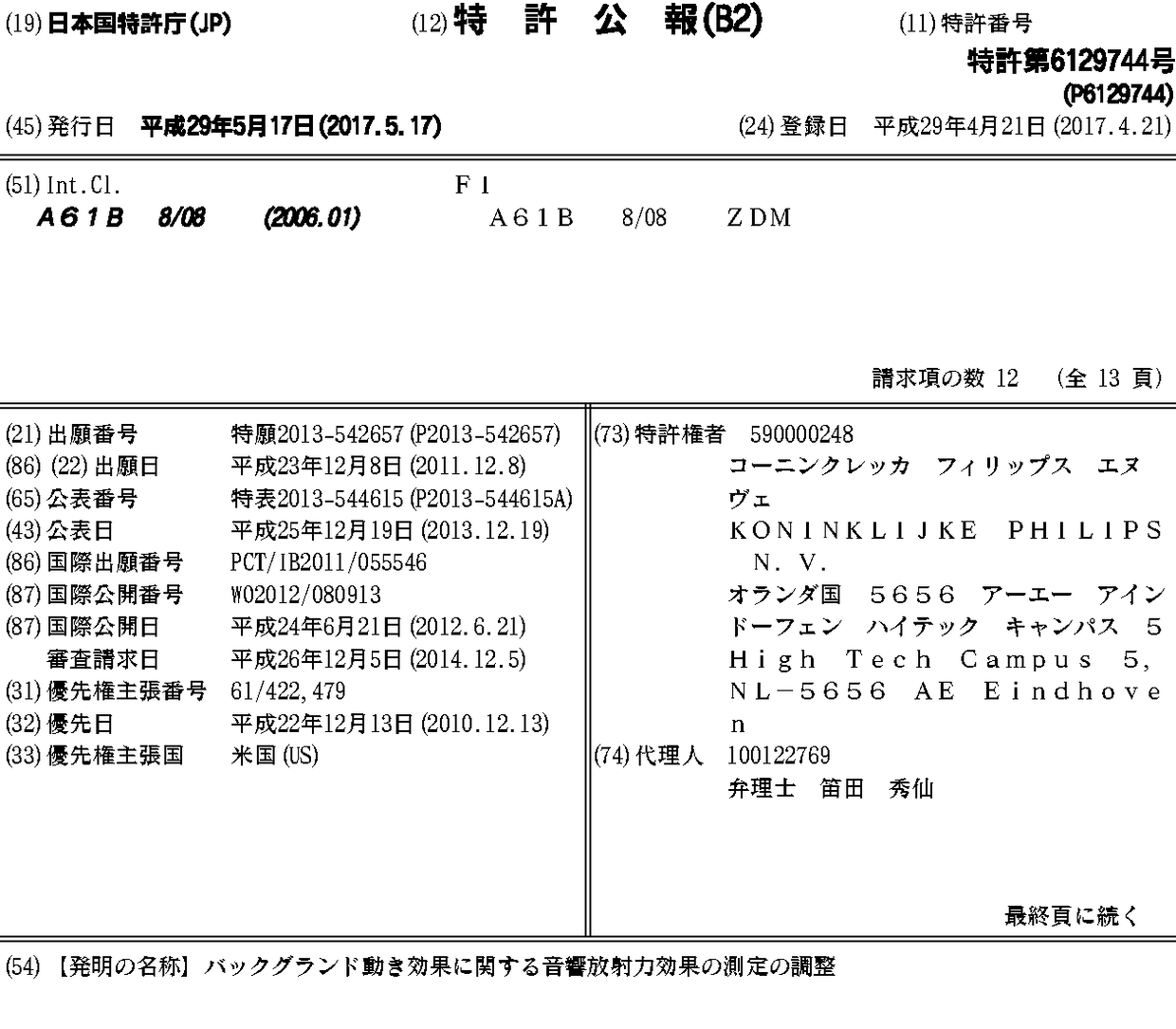 BR112013014422A2 | CN103260525A | CN103260525B | EP2651307A1 | EP2651307B1 | JP2013544615A | JP2013544615A5 | JP6129744B2 | RU2013132551A | RU2603051C2 | US10485514 | US20130296698A1 | US20200060655A1 | WO2012080913A1