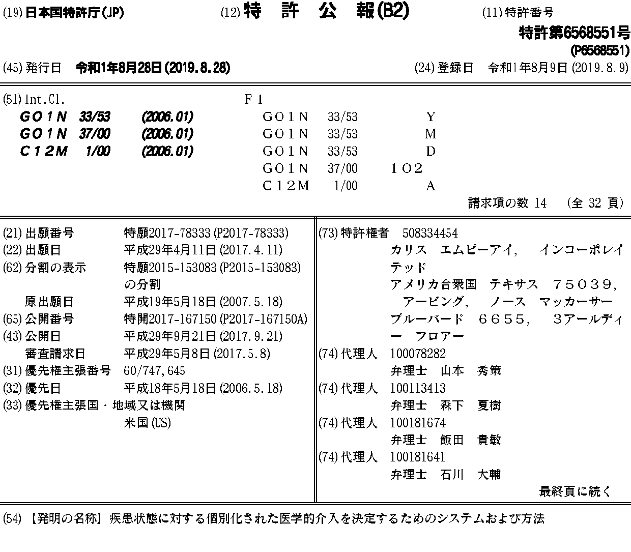 AU2007253740A1 | BRPI0711011A2 | CA2651995A1 | CA2651995C | CN101449162A | CN101449162B | CN103424541A | CN103424541B | CO6141496A2 | EP2032980A2 | EP2032980A4 | EP3399450A1 | HK1127904A | IL195266A | IL195266D0 | IL243717A | IL243717D0 | IL243718A | IL243718D0 | IL243719A | IL243719D0 | IL251666A | IL251666D0 | IL266164D0 | JP2009537154A | JP2013127477A | JP2013127477A5 | JP2015200678A | JP2017167150A | JP2020005641A | JP6129251B2 | JP6568551B2 | KR101356305B1 | KR1020090013198A | MX2008014608A | RU2008146868A | SG147788A1 | US20080014146A1 | US20140038846A1 | US20140113837A1 | US20140121121A1 | US20140149138A1 | US20140370582A1 | US20140371111A1 | US8700335 | US8831890 | US8880350 | US8914239 | US9372193 | US9383365 | WO2007137187A2 | WO2007137187A3 | ZA200809783B