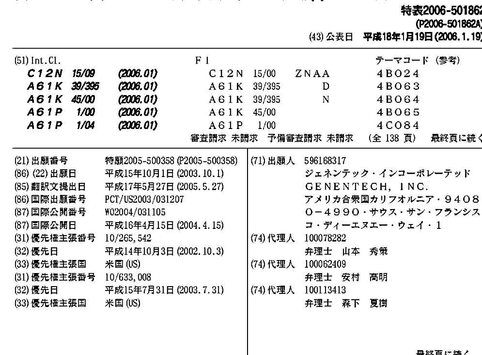 AT525480T | AU2003277226A1 | AU2003277226A2 | AU2003277226B2 | AU2010209998A1 | CA2498631A1 | CA2498631C | CA2868140A1 | DK1895017T3 | EP1558766A2 | EP1558766A4 | EP1895017A2 | EP1895017A3 | EP1895017B1 | EP2434022A2 | EP2434022A3 | ES2373981T3 | HK1078905A | HK1112941A | HK1112941A1 | HK1167268A | IL167452A | JP2006501862A | JP2006501862A5 | JP2010017187A | JP2013126418A | JP5319051B2 | KR101092173B1 | KR1020050065575A | MXPA05003440A | NZ539266A | NZ539266B | PT1895017E | US20040120957A1 | US20060233803A1 | US20070190049A1 | US20080312421A1 | US20090275738A1 | US7192589 | US7741056 | WO2004031105A2 | WO2004031105A3