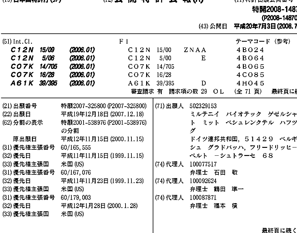 AU2001017233A1 | AU785198B2 | CA2396428A1 | CA2396428C | CA2664137A1 | CA2664137C | CN1454215A | CN1454215B | DE60033062D1 | DE60033062T2 | DK1301539T3 | EP1301539A2 | EP1301539B1 | EP1783141A1 | EP1813626A1 | EP1813626B1 | ES2280264T3 | JP2004512006A | JP2004512006A5 | JP2008148700A | JP2011092210A | JP2012152215A | JP5007007B2 | JP5355602B2 | JP5599834B2 | KR100868235B1 | KR1020030032904A | PT1301539E | WO2001036487A1 | WO2001036487A2 | WO2001036487A3
