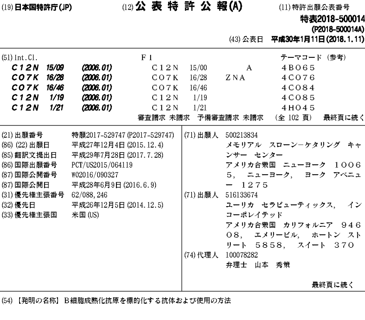 AU2015357533A1 | BR112017011914A2 | CA2969877A1 | CN107206076A | EP3226897A2 | EP3226897A4 | HK1243956A | IL252624D0 | JP2018500014A | JP2018500014A5 | KR1020170108944A | MX2017007246A | PH12017501127A1 | RU2017123549A | RU2017123549A3 | SG10201901707QA | SG11201704548PA | US10562972 | US20180118842A1 | US20200123266A1 | WO2016090327A2 | WO2016090327A3