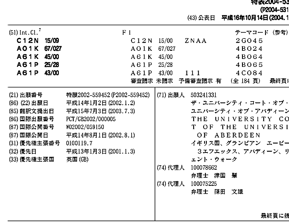 AT548453T | AU2002217310A1 | AU2002217310B2 | CA2433535A1 | CA2433535C | DK1348029T3 | EP1348029A2 | EP1348029B1 | ES2382457T3 | GB0100119D0 | HK1056574A | HK1056574A1 | JP2004531224A | JP2004531224A5 | JP4580618B2 | PT1348029E | US20040078835A1 | US7834237 | WO2002059150A2 | WO2002059150A3