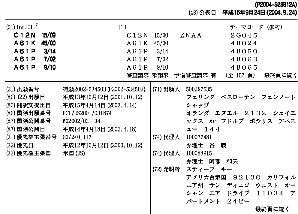 AU2002013138A1 | AU2002213138B2 | CA2425001A1 | CN100354417C | CN101270362A | CN1636061A | CZ20031301A3 | EP1346033A2 | HK1078104A | HK1078104A1 | HU0301356A2 | HU0301356A3 | IL155245A | IL155245D0 | JP2004528812A | JP2004528812A5 | KR100875221B1 | KR1020030038815A | MXPA03003191A | NO20031702A | NO20031702D0 | NO20031702L | NO329842B1 | NZ525443A | NZ525443B | PL366005A1 | RU2003112700A | RU2305133C2 | SG96013A1 | US20020115843A1 | US20050059081A1 | US6844180 | US7157241 | WO2002031134A2 | WO2002031134A3 | ZA200303306B