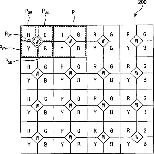 Liquid crystal display with the red, green, blue, and yellow sub-pixels surrounding the white sub-pixel