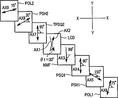 Liquid crystal display device with particular phase plates having specific axis angles