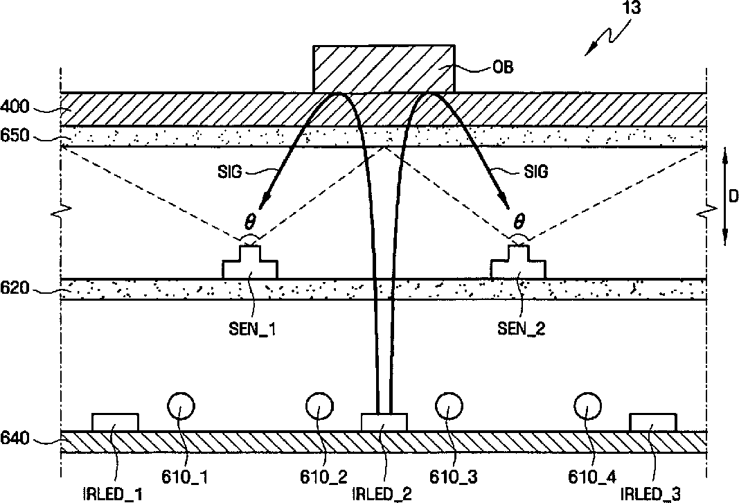 Liquid crystal display having first and second diffusion members and a plurality of sensors that can detect a sensing signal reflected from an object