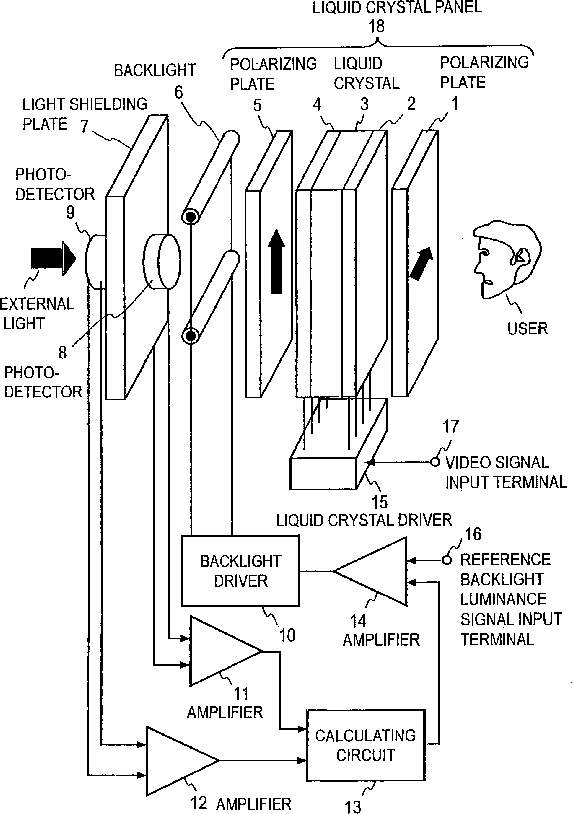 Liquid crystal display with photodetectors having polarizing plates mounted thereon and its correcting method