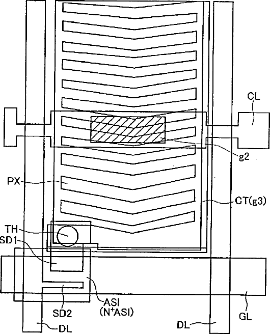 Liquid crystal display device with a counter voltage line intersecting the drain lines