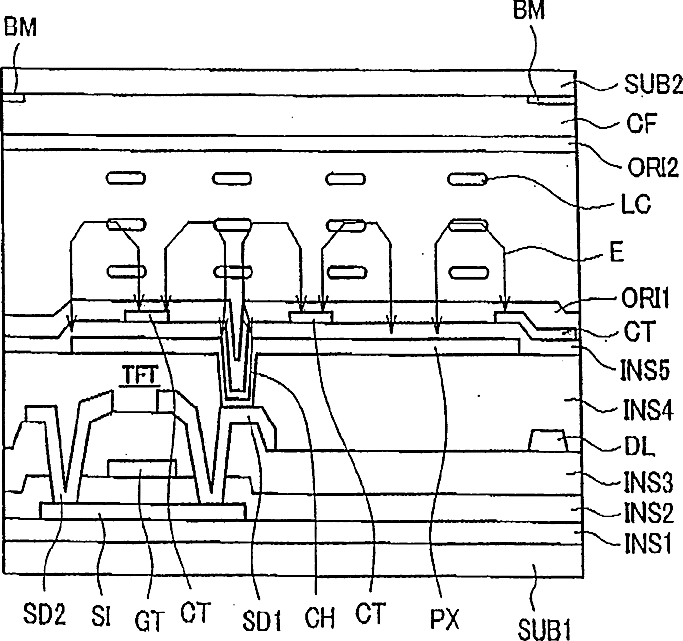 Liquid Crystal Display Device Having Rectangular-Shaped Pixel Electrodes Overlapping with Comb-Shaped Counter Electrodes in Plan View
