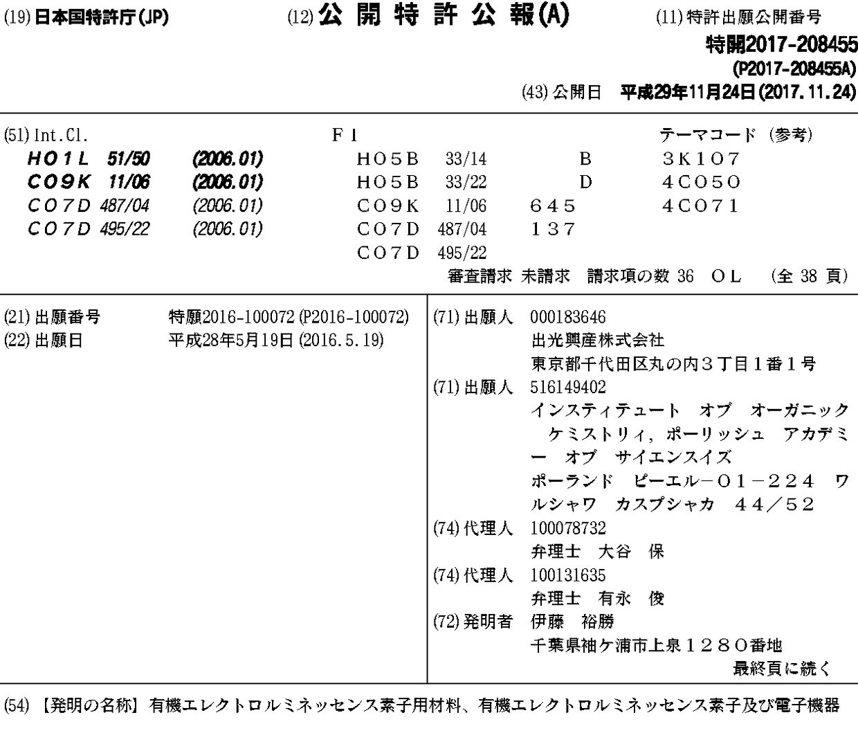 出光興産株式会社 | インスティテュート オブ オーガニック ケミストリィ,ポーリッシュ アカデミー オブ サイエンスイズ