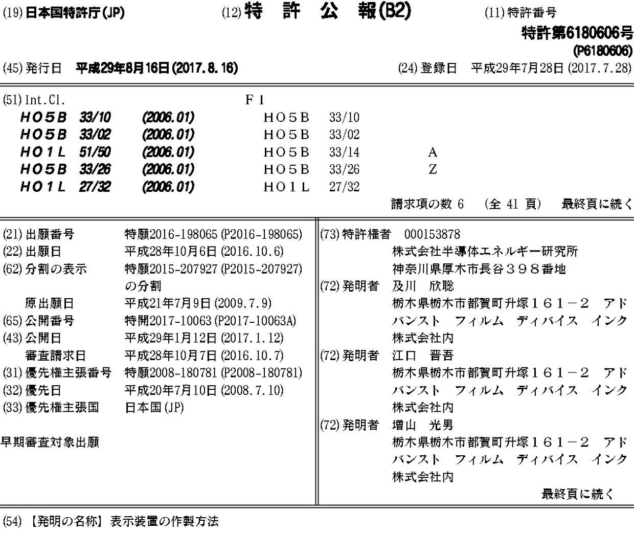 JP2010040522A | JP2010040522A5 | JP2014220259A | JP2016012576A | JP2017010063A | JP2017011308A | JP2017216247A | JP2019140111A | JP5829735B2 | JP6082797B2 | JP6177982B2 | JP6180606B2 | JP6510590B2 | KR101588576B1 | KR101753574B1 | KR101802137B1 | KR101925772B1 | KR1020110038032A | KR1020150068497A | KR1020170076792A | KR1020170129961A | KR1020180129978A | KR102026604B1 | TW201014442A | TW201547316A | TW201720225A | TW201902296A | TW201933938A | TWI500355B | TWI565354B | TWI663891B | TWI663892B | TWI674031B | US10079330 | US10205062 | US20100013372A1 | US20120326145A1 | US20150060890A1 | US20180374995A1 | US20190189856A1 | US8264144 | US8860306 | WO2010005064A1
