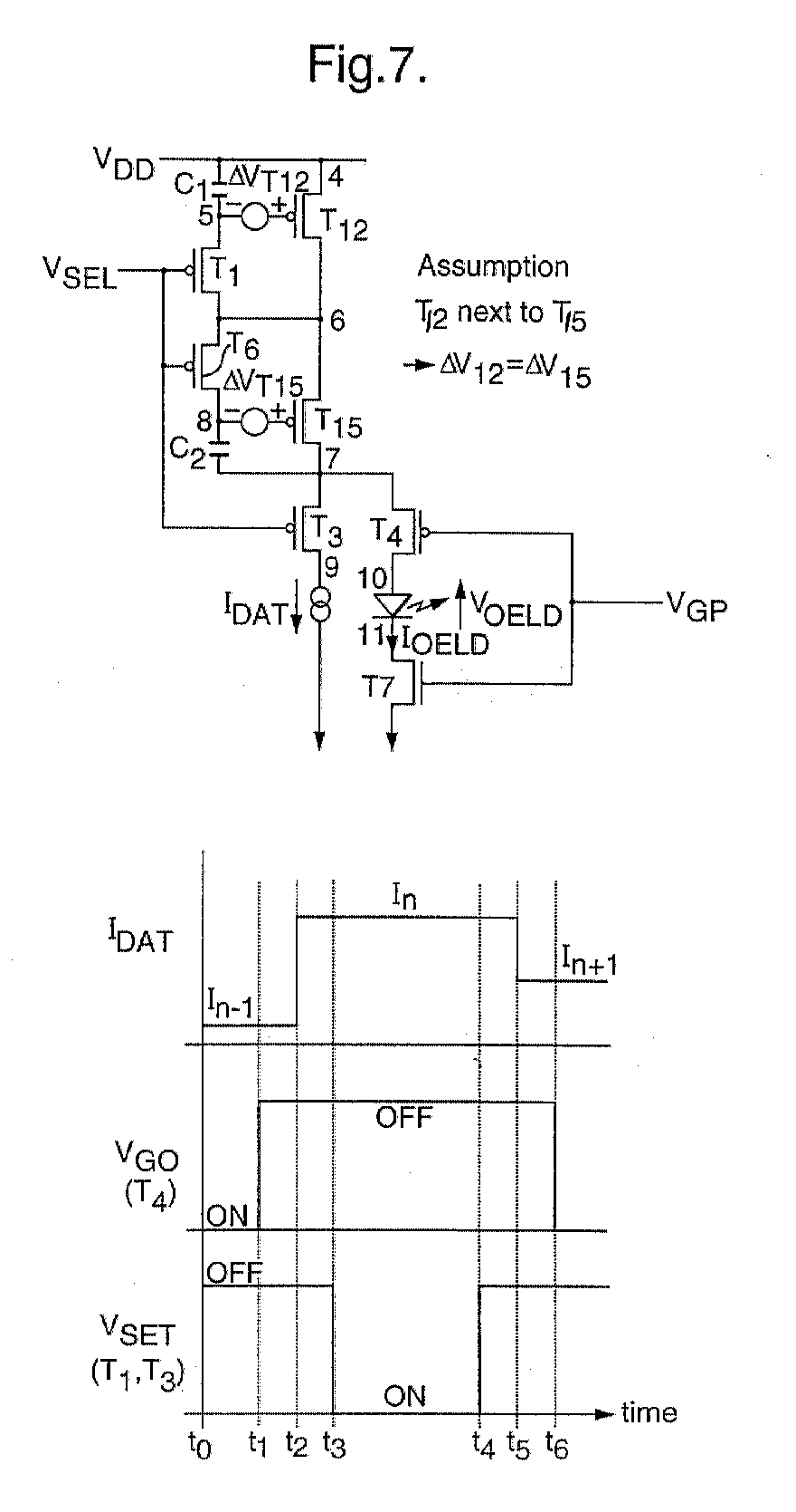 Current driven electrooptical device, e.g. organic electroluminescent display, with complementary driving transistors to counteract threshold voltage variations