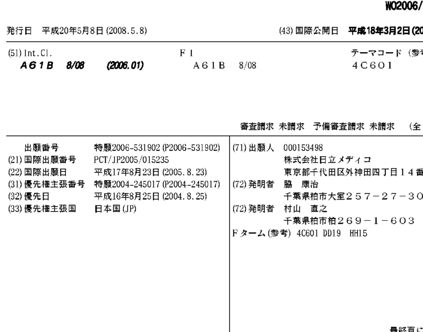 CN100563582C | CN101005806A | EP1782736A1 | EP1782736A4 | EP1782736B1 | JP4762144B2 | JPWO2006022238A1 | US20080188743A1 | US7871380 | WO2006022238A1