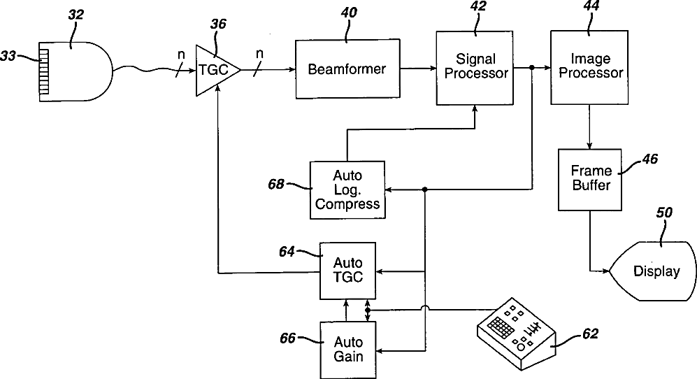 Ultrasonic diagnostic imaging system with automatically controlled contrast and brightness