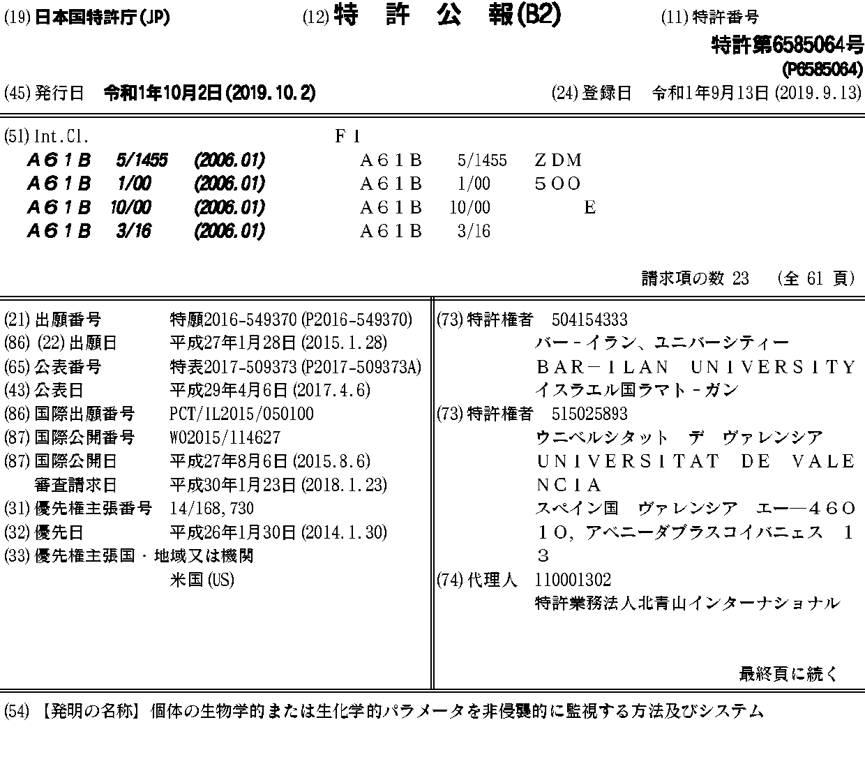 AU2015212330A1 | AU2015212330B2 | CA2937109A1 | CN106061373A | CN106061373B | EP2667778A2 | EP3099223A1 | EP3099223A4 | HK1228716A | IL246815D0 | JP2017509373A | JP6585064B2 | KR1020160114711A | US10390729 | US20130144137A1 | US20140148658A1 | US20180110442A1 | US20190374132A1 | US9636041 | US9668672 | WO2012101644A2 | WO2012101644A3 | WO2015114627A1