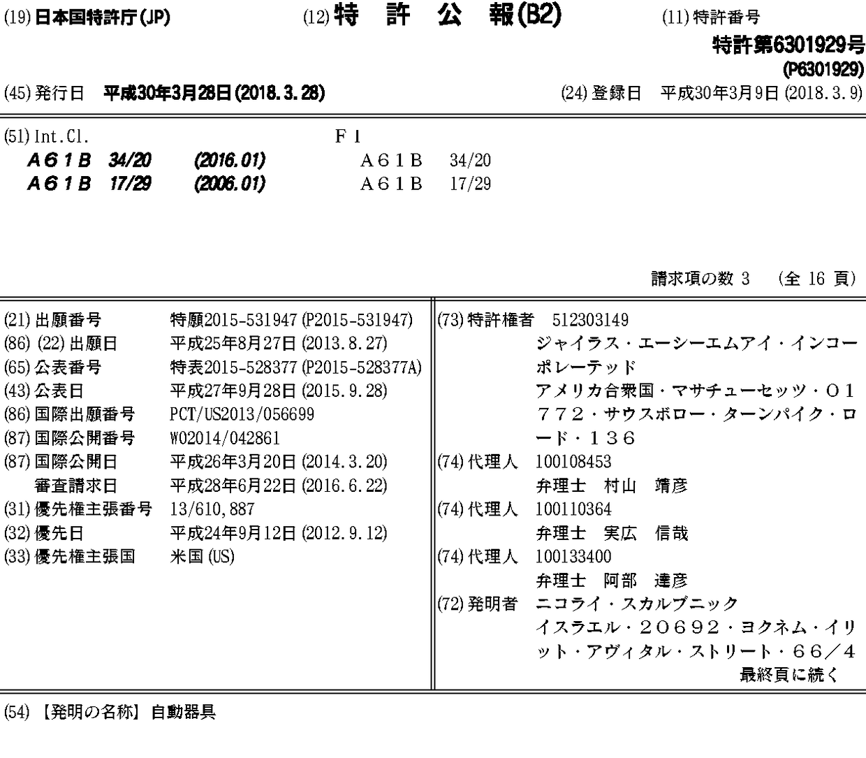 JP2015528377A | JP2018061858A | JP6301929B2 | JP6517957B2 | US20140074134A1 | US9131957 | WO2014042861A1