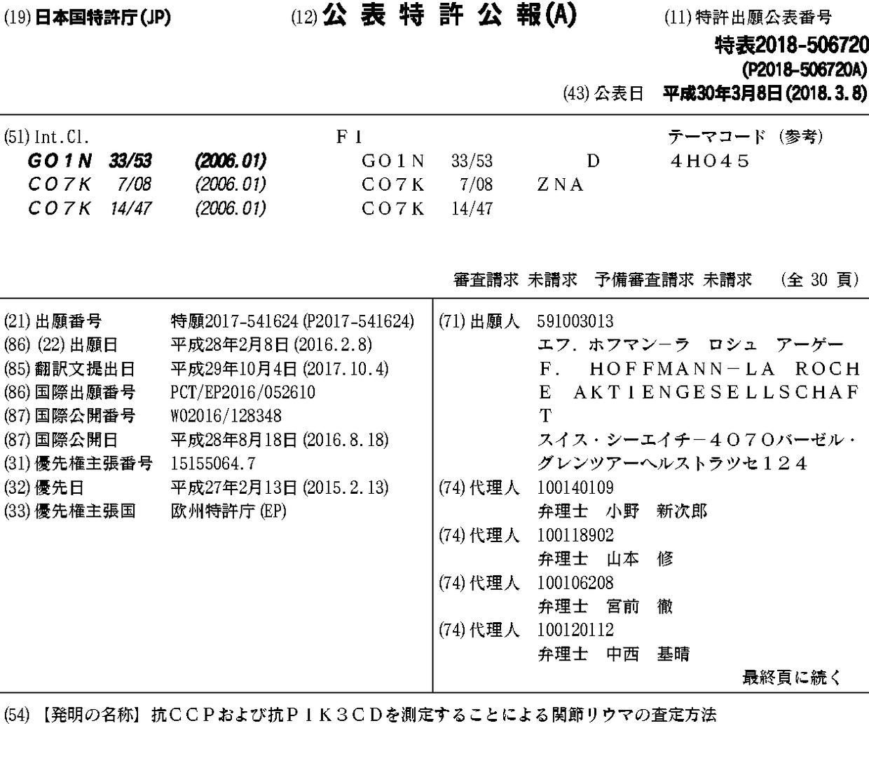 CN107484423A | EP3256854A1 | JP2018506720A | US10094826 | US20180003710A1 | WO2016128348A1