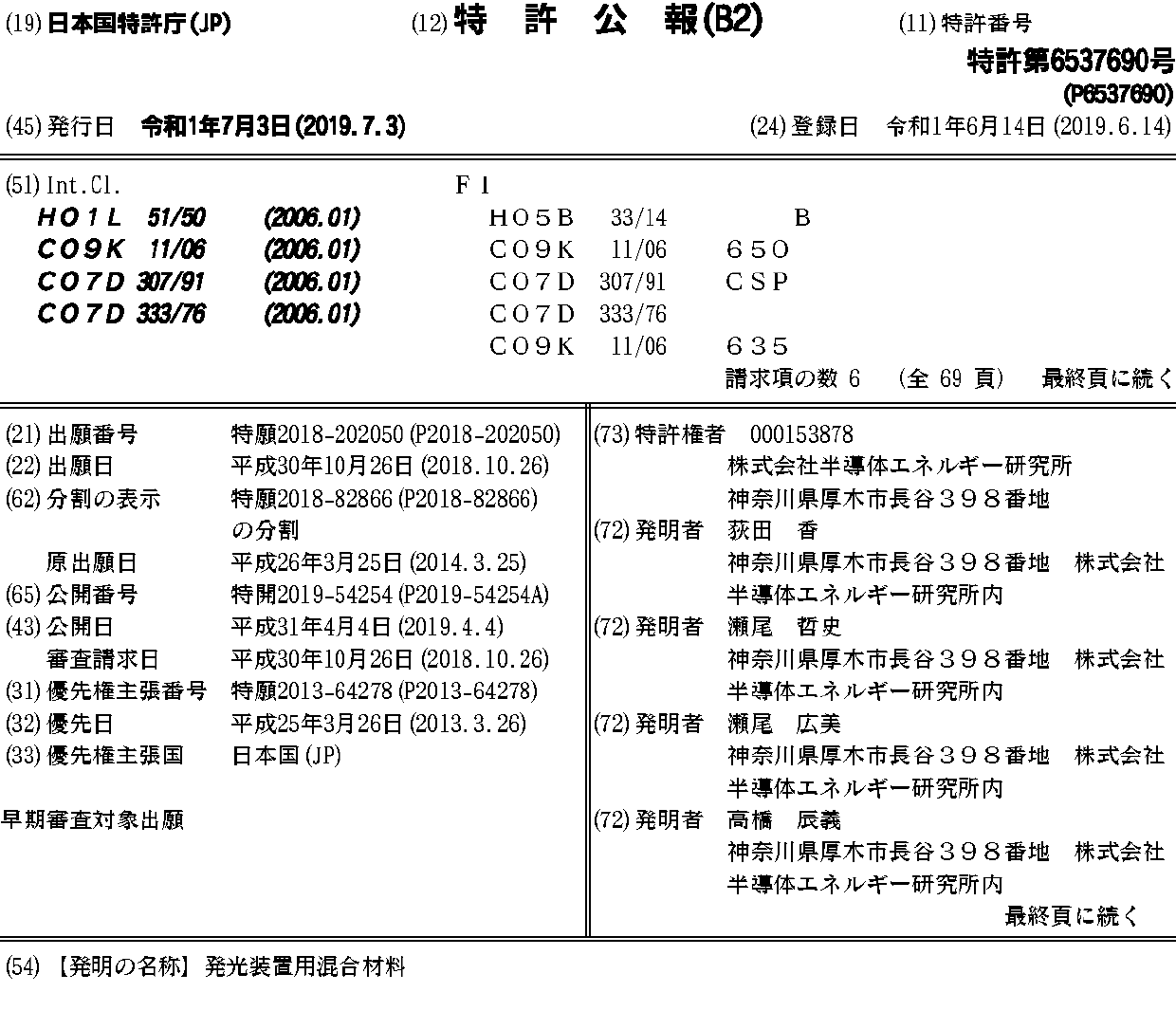 JP2014208621A | JP2014208621A5 | JP2018129543A | JP2019033292A | JP2019033293A | JP2019054253A | JP2019054254A | JP2019218367A | JP6333009B2 | JP6488046B2 | JP6488054B2 | JP6488055B2 | JP6537690B2 | JP6568993B2 | KR1020150135289A | KR1020180123593A | KR1020190119684A | KR102034819B1 | KR102136040B1 | TW201504219A | TW201741291A | TWI603964B | TWI620742B | US10347847 | US10446766 | US20140291643A1 | US20170256724A1 | US20190088886A1 | US20200111975A1 | US9634263 | WO2014157018A1