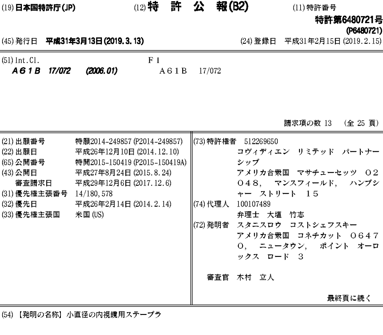 AU2014259543A1 | AU2014259543B2 | CA2873248A1 | EP2907456A1 | EP2907456B1 | EP3173030A1 | EP3173030B1 | ES2635286T3 | ES2754799T3 | JP2015150419A | JP2019069189A | JP6480721B2 | US10499911 | US20150230793A1 | US20180070940A1 | US20180280025A1 | US9848874 | US9987004