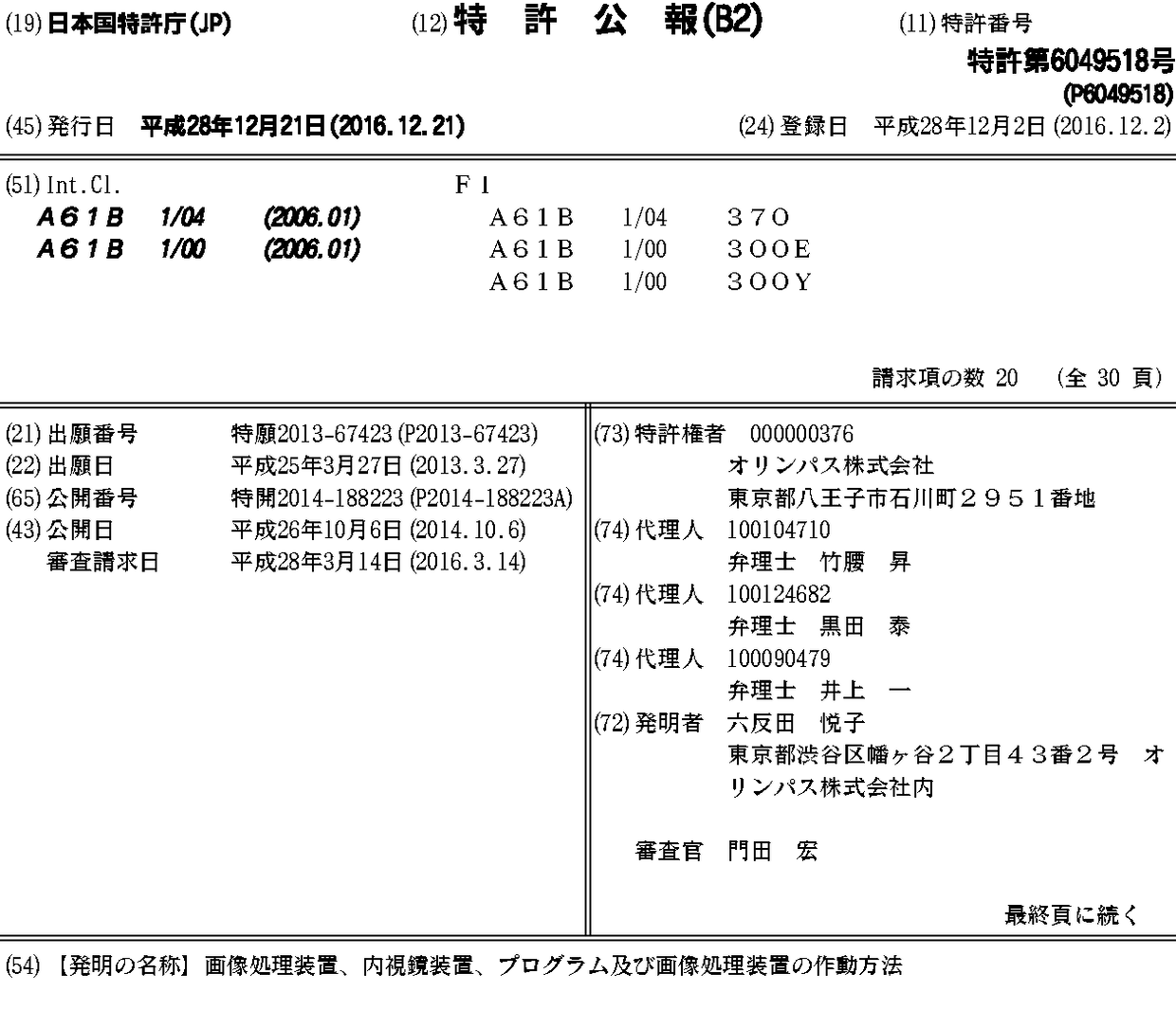 CN105072968A | EP2979606A1 | EP2979606A4 | JP2014188223A | JP2014188223A5 | JP6049518B2 | US20160014328A1 | WO2014155782A1