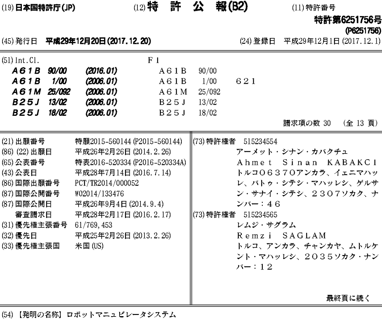CN105283144A | CN105283144B | EA033708B1 | EA201591544A1 | EP2964069A1 | EP2964069B1 | EP2964069B8 | IL240868D0 | JP2016520334A | JP6251756B2 | KR1020150124446A | US10219867 | US20140243849A1 | WO2014133476A1