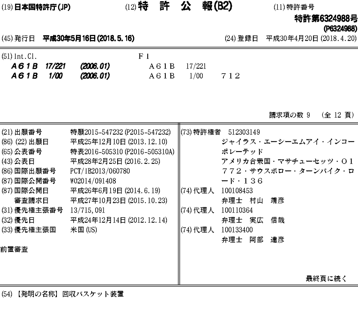 CN104837421A | CN104837421B | EP2908742A1 | EP3626186A1 | JP2016505310A | JP2016505310A5 | JP6324988B2 | US20140171735A1 | US20160015407A1 | US9192402 | US9936967 | WO2014091408A1
