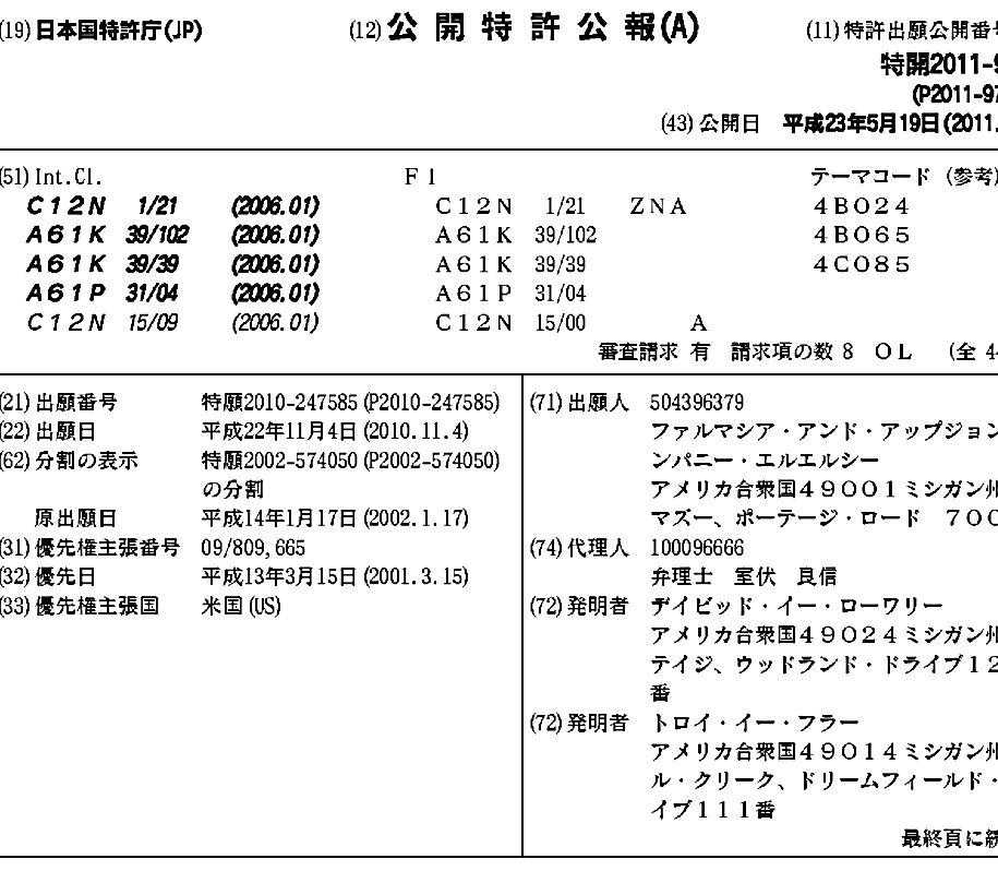 AR035745A1 | AR071888A2 | AT500316T | AU2002240033A1 | AU2002240033B2 | CA2438315A1 | CA2438315C | CA2852293A1 | CY1112014T1 | DE60239318D1 | DK1368456T3 | EP1368456A2 | EP1368456B1 | ES2362041T3 | JP2005502315A | JP2005502315A5 | JP2011097938A | MXPA03008296A | NZ528208A | NZ528208B | PE0020021008A1 | PT1368456E | SI1368456T1 | TW200916577A | TW201040261A | TW201040262A | TWI328035B | TWI334884B | TWI335934B | TWI335935B | US20040110268A1 | US20050003512A1 | US6790950 | US7476391 | WO2002075507A2 | WO2002075507A3 | WO2002075507B1