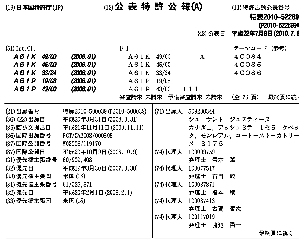 AU2008234374A1 | AU2008234374B2 | CA2682114A1 | CA2682114C | CN101680887A | CN101680887B | EP2132568A1 | EP2132568A4 | EP2132568B1 | HK1132550A | HK1132550A1 | IL201186A | IL201186D0 | JP2010522699A | JP2010522699A5 | JP5426530B2 | KR101436578B1 | KR1020100016075A | MX2009010400A | US10073101 | US20100075333A1 | US20130266966A1 | US20150323553A1 | WO2008119170A1