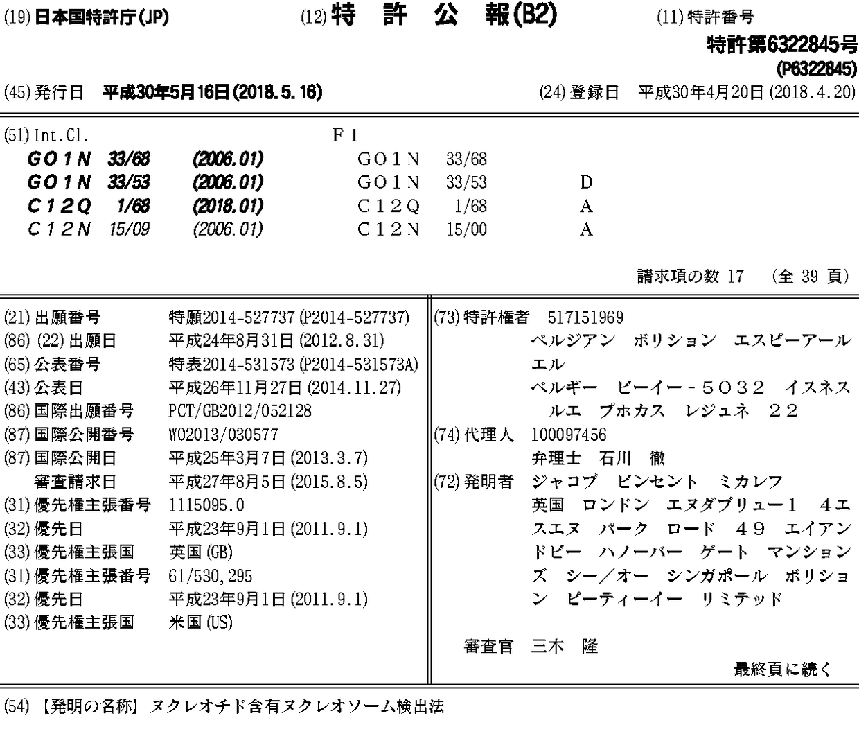 AU2012300641A1 | AU2012300641B2 | BR112014005087A2 | CA2845993A1 | CN104067124A | CN104067124B | DK2751568T3 | EP2751568A1 | EP2751568B1 | EP3483608A1 | ES2717659T3 | GB201115095D0 | HK1199760A | HK1199760A1 | HK40008468A | HRP20190533T1 | HUE043386T2 | JP2014531573A | JP2014531573A5 | JP6322845B2 | KR1020140078637A | KR102074528B1 | MX2014002443A | MX364410B | PL2751568T3 | PT2751568T | RU2014112350A | RU2017126701A | RU2017126701A3 | RU2687483C2 | SG10201601153RA | SG11201400270PA | TR201904386T4 | US20140363812A1 | WO2013030577A1 | ZA201401295B