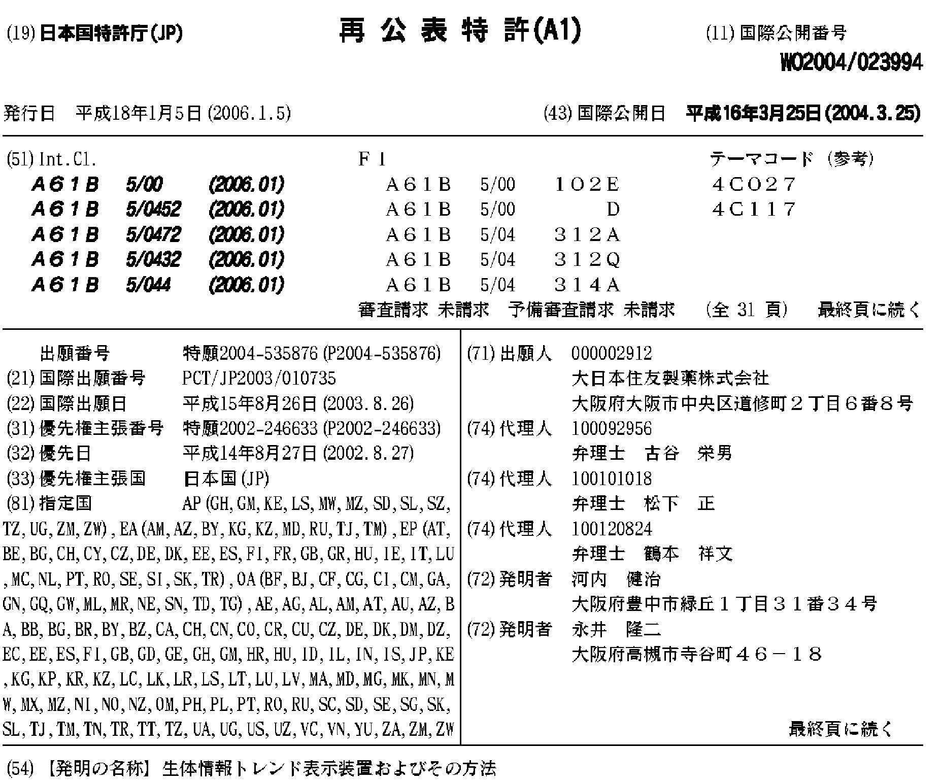 AU2003261717A1 | CN100435724C | CN101310677A | CN101310677B | CN1678237A | EP1547519A1 | EP1547519A4 | EP3081159A1 | HK1076997A | HK1121358A | HK1121358A1 | JP4373915B2 | JPWO2004023994A1 | US20050246366A1 | US20100238192A1 | US8781751 | WO2004023994A1
