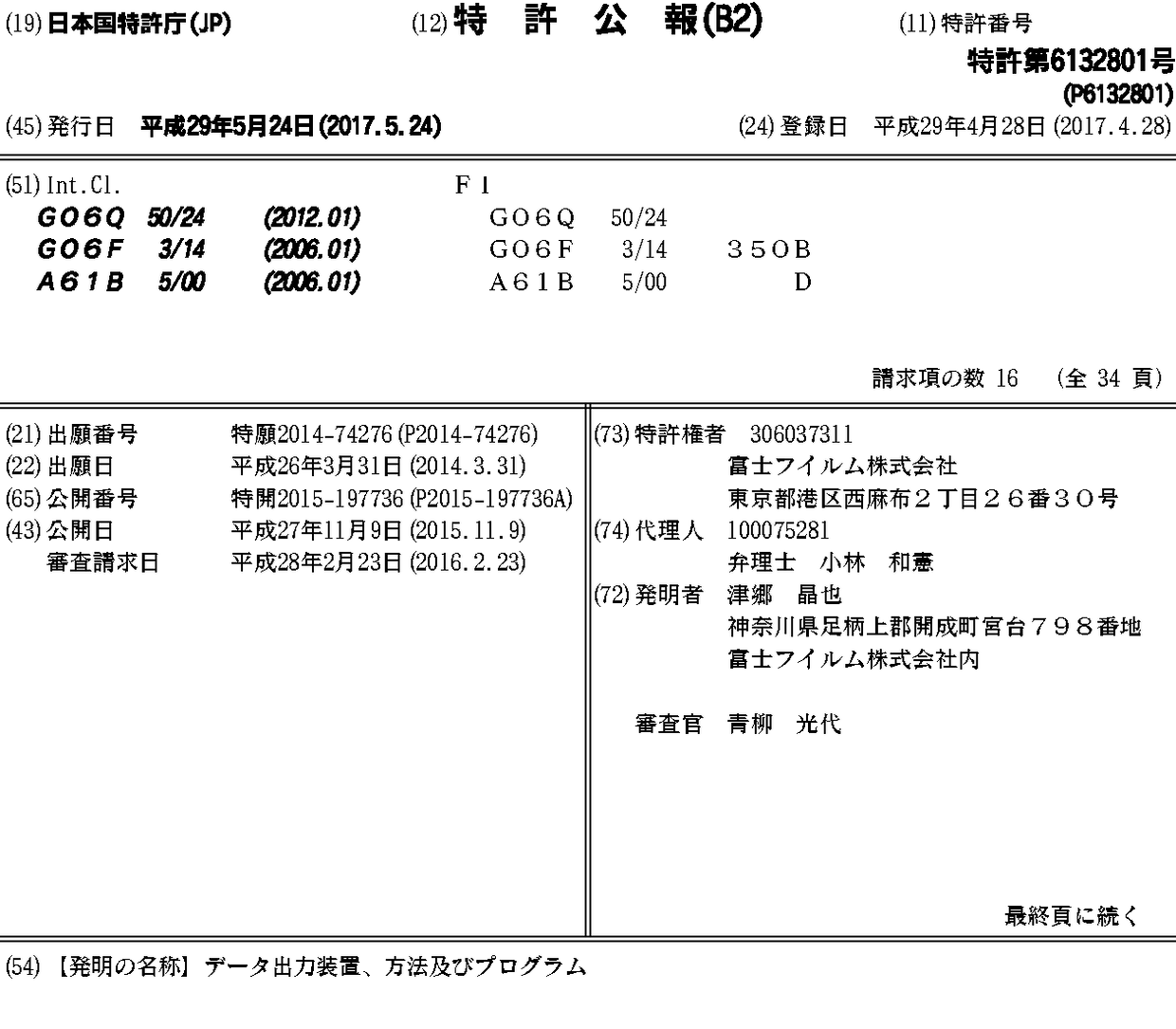 CN106164916A | CN106164916B | JP2015197736A | JP6132801B2 | US10052072 | US20170014090A1 | WO2015151805A1