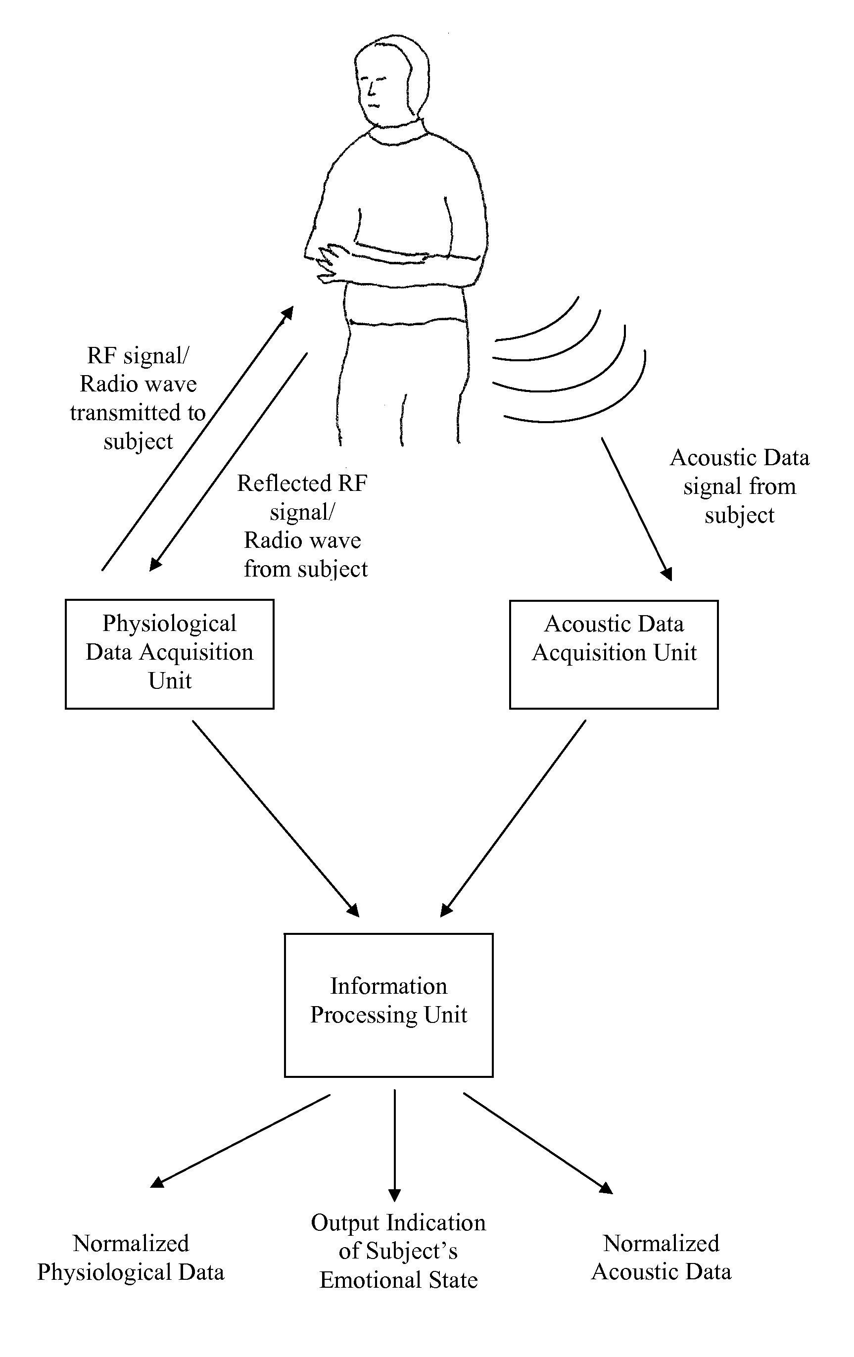 Method and apparatus for evaluation of a subject's emotional, physiological and/or physical state with the subject's physiological and/or acoustic data