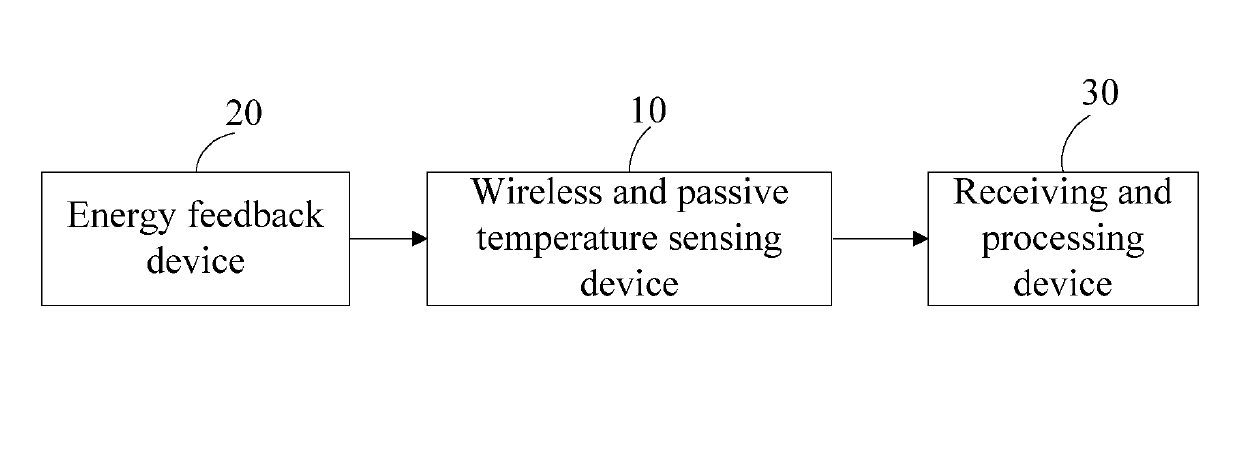 Method and system for wirelessly and passively measuring temperature and devices forming the system