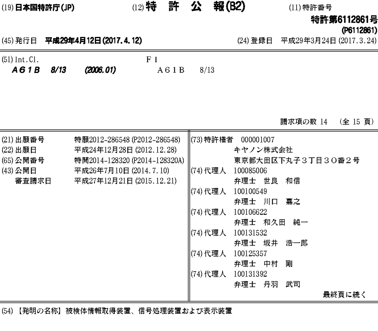 CN103908294A | CN103908294B | CN106361290A | CN106361290B | EP2749226A1 | JP2014128320A | JP2014128320A5 | JP6112861B2 | US20140187902A1