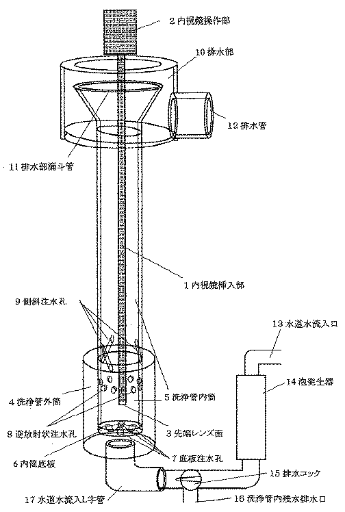 逆放射状および渦巻き水流による鼻咽喉軟性内視鏡流水洗浄器