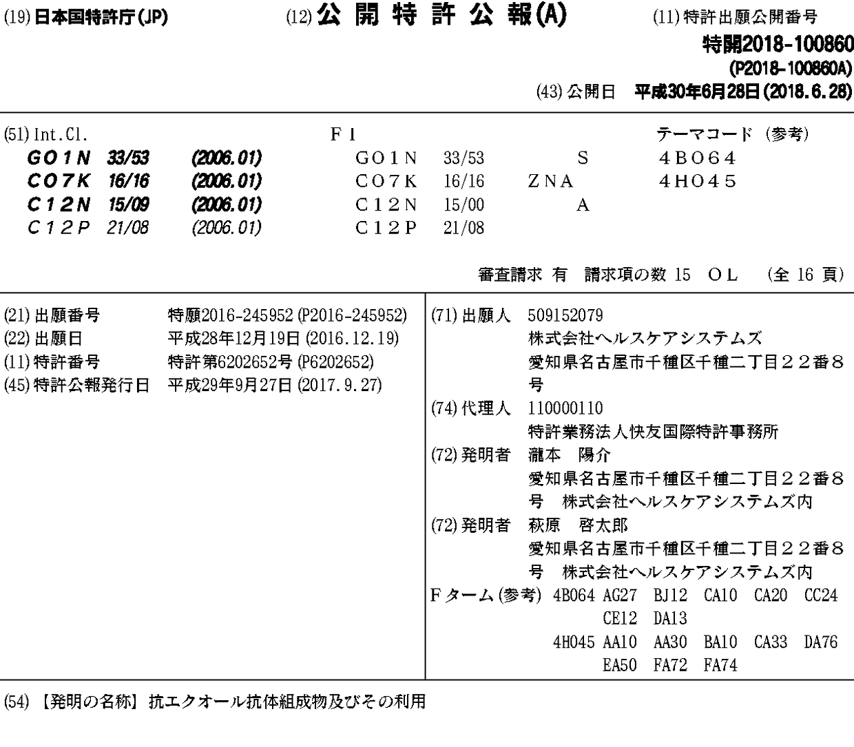 CN110622002A | EP3540437A1 | EP3540437A4 | JP2018100860A | JP6202652B1 | US10538580 | US20190300597A1 | WO2018117044A1