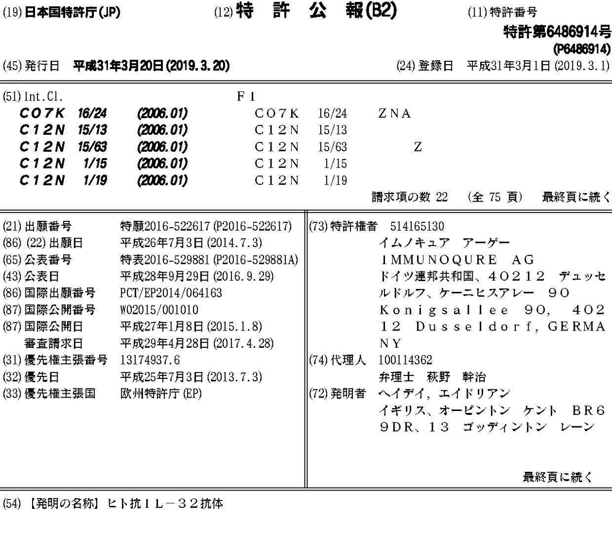 AU2014286128A1 | AU2014286128B2 | CA2916895A1 | CN105518024A | CN105518024B | CN110724193A | DK3016977T3 | DK3016977T4 | EP3016977A1 | EP3016977B1 | ES2768335T3 | HK1219962A | HRP20200058T1 | JP2016529881A | JP6486914B2 | KR1020160028465A | PL3016977T3 | PT3016977T | SI3016977T1 | US10081676 | US20160368981A1 | US20190112367A1 | WO2015001010A1